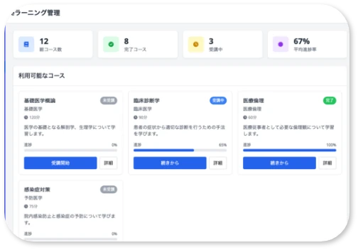 会員向けオンライン学習を提供。資格更新やスキルアップに貢献し、場所を選ばず学習機会を創出します。オプション追加で柔軟に対応。