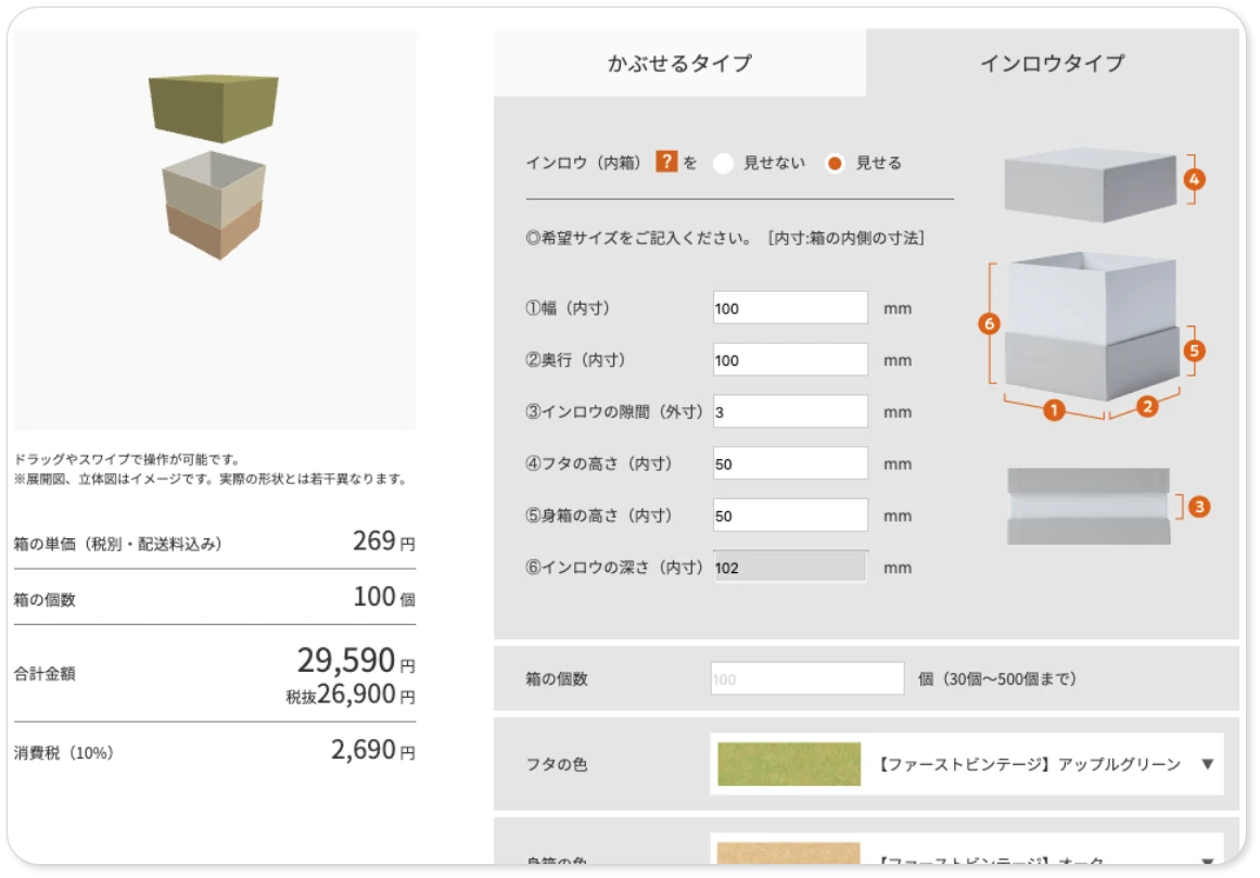 ユーザーが入力した情報に合わせて、箱のイメージを3Dで表示し、かつ、見積もり費用もリアルタイムにページ上に表示することで、ユーザーの操作性を高めつつ、購買意欲を向上させる工夫を取り入れました。