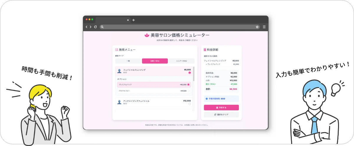 美容サロンを想定した料金シミュレーションシステムのデモ版となります。ご納品するシステムはお客様に合わせてカスタマイズとなりますので、デモは実際のシステムと異なります。
